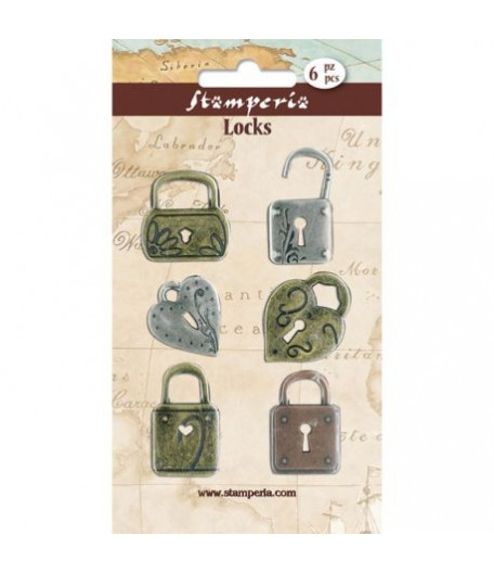 Confezione da 6 lucchetti in metallo di forme diverse by Stamperia.
