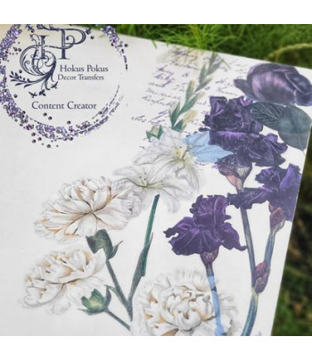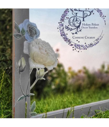 Bellissimo TRANSFER (trasferibile) con stampe floreali, applicabile, semplicemente grattando, con l'apposito accessorio incluso nella confezione, su tutte le superfici: mobili, pareti, oggetti, vetri e specchi. Si raccomanda un'accurata pulizia del supporto prima dell'uso e di far asciugare perfettamente il supporto se verniciato. Proteggere, dopo l'applicazione, con cera trasparente o vernice protettiva.