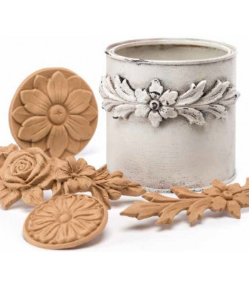 Questi speciali decori sono realizzati con una pasta di legno modellabile con il calore, rendendoli perfettamente adattabili a superfici curve o sagomate.