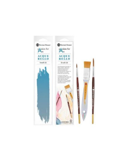 Contiene una selezione di 3 pennelli in filati sintetici dalle fibre morbide e sottili, a lento rilascio d’acqua che permettano lavorazioni su carta bagnata senza graffiarla e tratti lunghi e definiti.