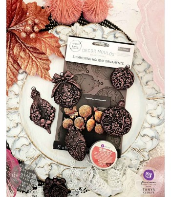 Lo stampo Shimmering Holiday Ornaments Décor Mould® include una splendida selezione di palline in rilievo con motivi floreali, fiocchi, perle e texture di ispirazione barocca. Questo stampo è inoltre dotato di cordoncini intrecciati e fili di perline: il tocco finale perfetto per creare decorazioni realistiche e tridimensionali.