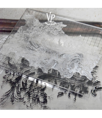 Una volta staccato l’elemento desiderato applicarlo su un blocco trasparente. Inchiostrare e timbrare il disegno.